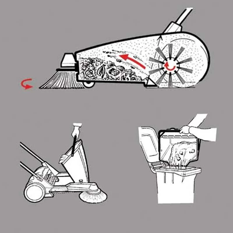 - Plegado completo de la barredora sin agacharse para un almacenaje en espacio reducido.